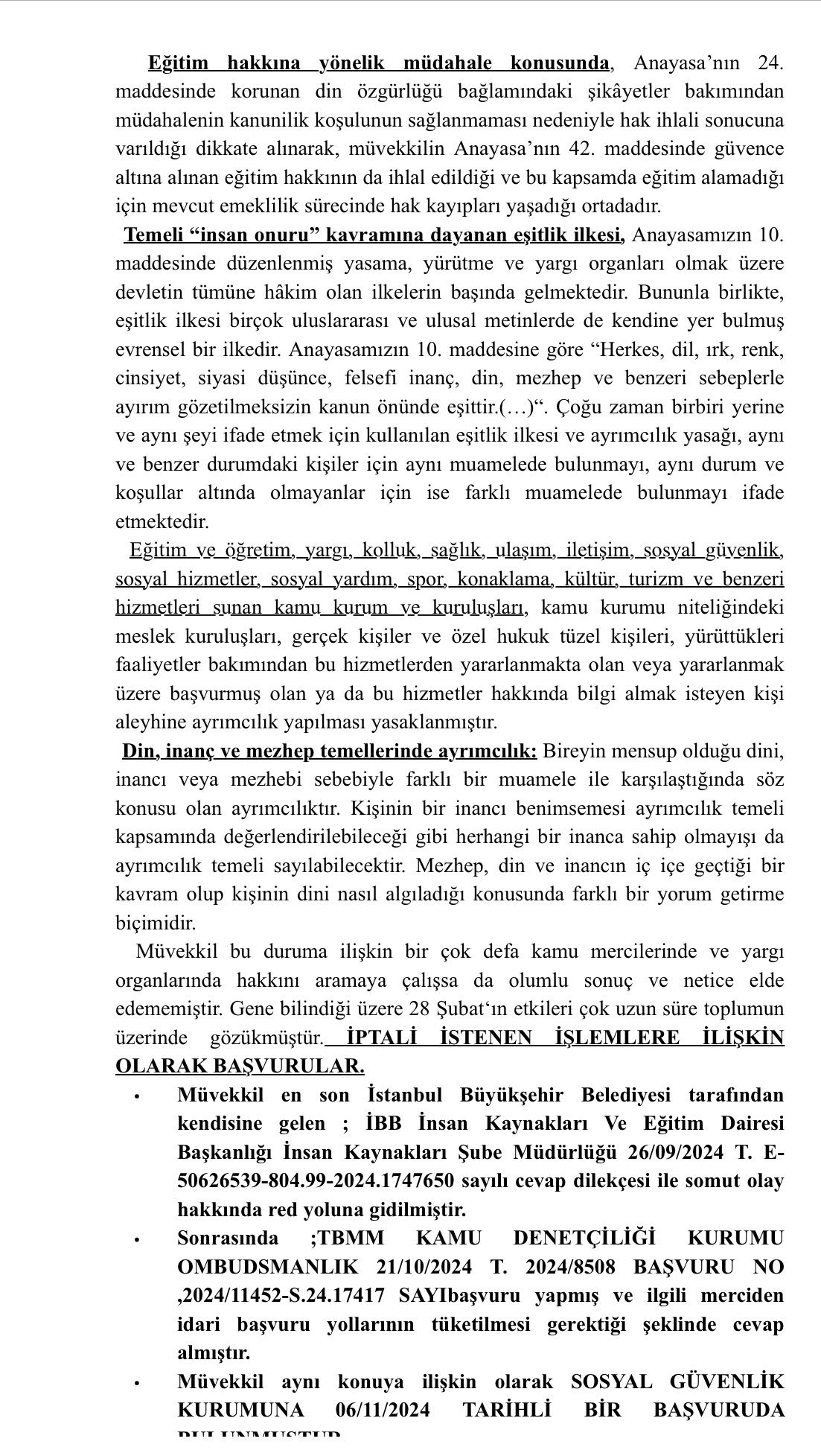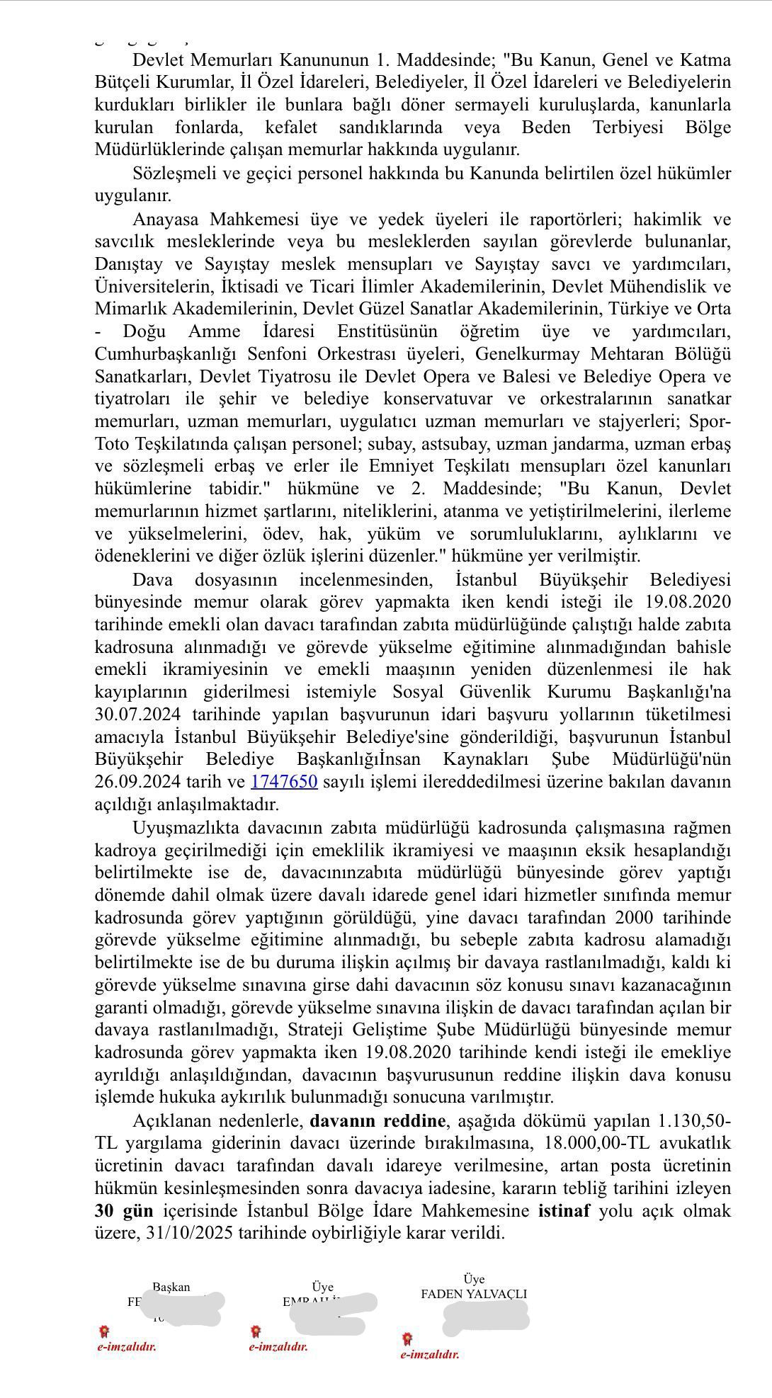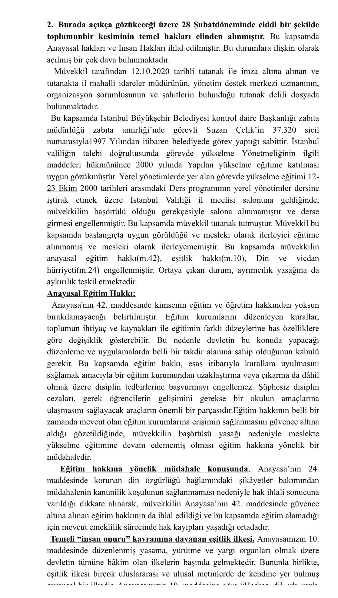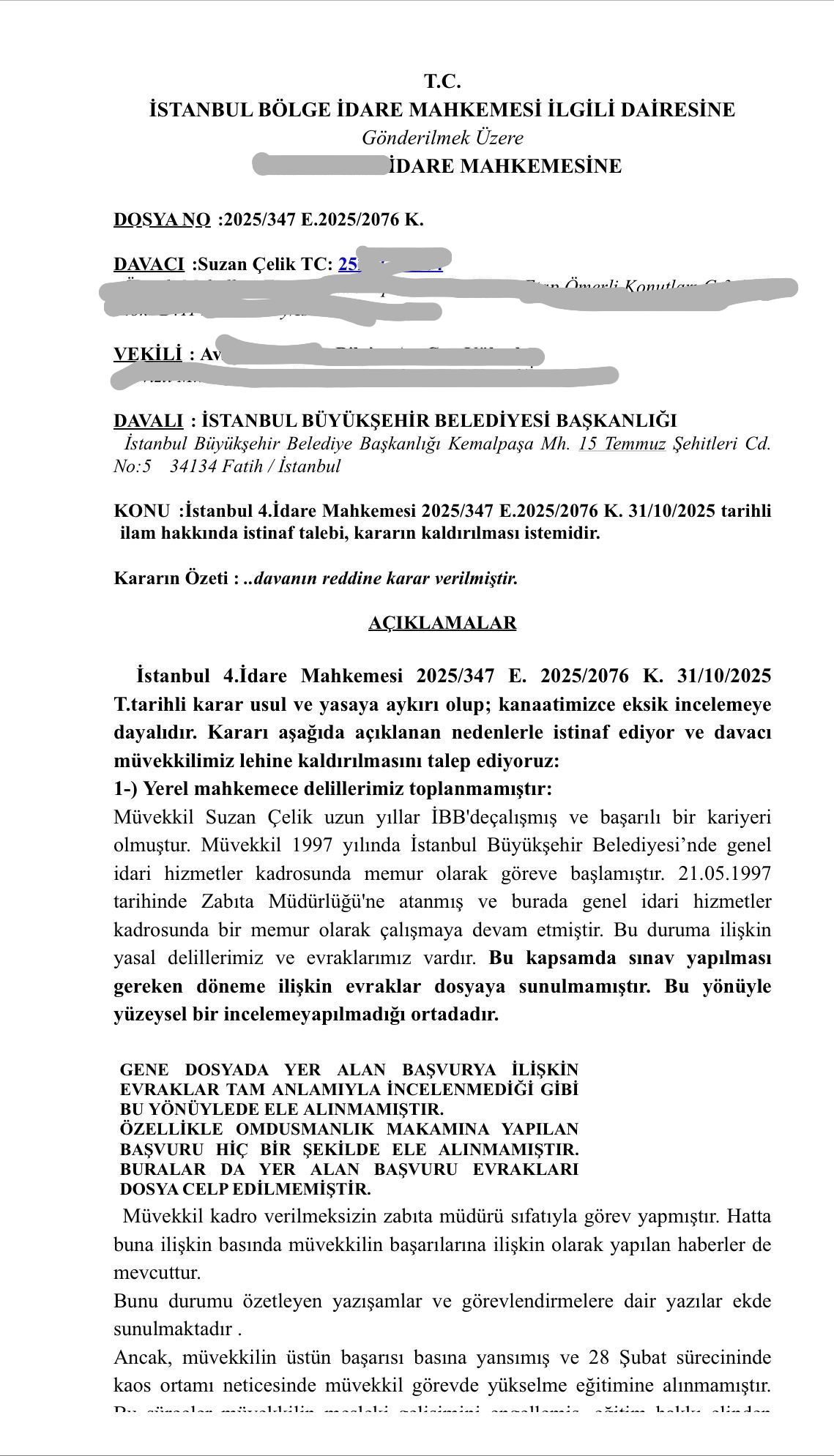 28 Şubat sürecinde başörtüsü konulu mağduriyete dair emekli aylığı ve ikramiyenin düzeltilmesi yolunda açılan dava İstanbul 4. İdare Mahkemesi'nde 2025/347 dosya numarasıyla reddedildi ama Suzan ÇELİK kararın düzeltilmesi için avukatları aracılığıyla istinaf mahkemesine gitti. Böylelikle tüm 28 Şubat Mağdurları için emsal bir karar bekleniyor. Bu nedenle dava oldukça önemli.