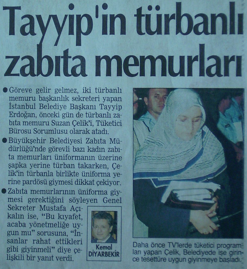 Devlet Memuru Suzan ÇELİK Cumhurbaşkanı R. Tayyip ERDOĞAN döneminde İstanbul Büyükşehir Belediyesi'nde devlet memuru olarak çalışıyorken zabıtada müdür sıfatıyla görev yaptığı halde başörtülü olduğu için zabıta kadrosu alamamış, başörtülü olduğu gerekçe gösterilerek görevde yükselme eğitimine alınmamıştı.