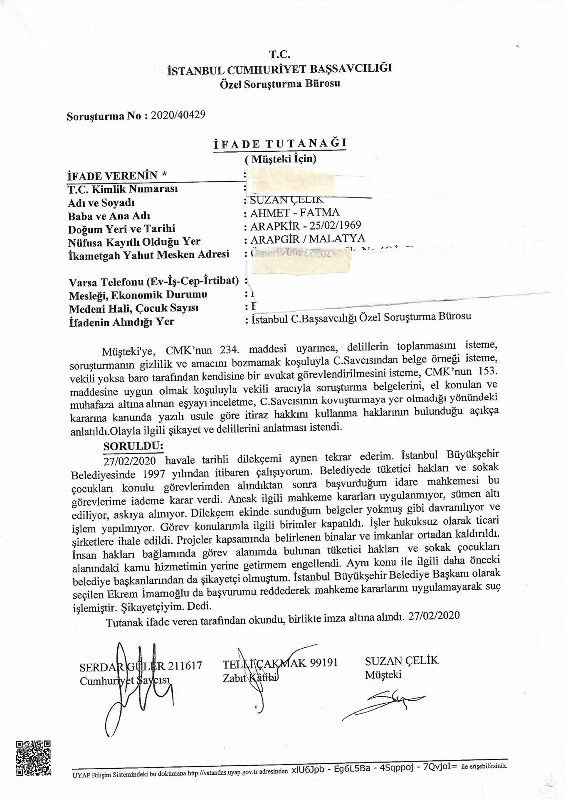 İstanbul Büyükşehir Belediyesi ekseninde kamuda sokak çocukları ve tüketici hakları konulu BÜYÜK HUKUKSUZLUKLAR icra edilmiş; MİLLET ADINA VERİLMİŞ mahkeme kararları uygulanmamış, hem mahkeme kararlarının uygulanmaması hususunda, hem de sokak çocukları ve tüketici hakları konulu birimlerin kapatılması şeklinde yürütülen hukuksuzluklar hakkında suç duyuruları Ak Parti İktidarında İçişleri Bakanlıkları ve Valiliklerce soruşturma izni verilmemesi neticesi hükümsüz kalmıştır. Cumhurbaşkanı R. Tayyip ERDOĞAN yönetimindeki Ak Parti İktidarı döneminde mahkemelerce İdare Mahkemeleri ve Danıştay Mahkemelerince verilmiş kararlar hilafında kararlar verilmiş, böylelikle zaten İBB'de başörtüsü gibi konularda sayısız soruşturma geçiren Suzan ÇELİK'in dayanılmaz baskılar ve sürgünler neticesi bir bebeği 4 buçuk aylık anne karnı hayatının ardından KATLEDİLMİŞTİR! Bu hususta da Savcılığa belgeler sunulurak SUÇ DUYURUSU yapılmış, yine Ak Parti İktidarı döneminde hiçbir netice alınamamıştır. Olaylar bir dönem gazetelere yansırken, basının yandaş medya şekline dönüşmesi neticesi gündeme gelmez olmuştur.