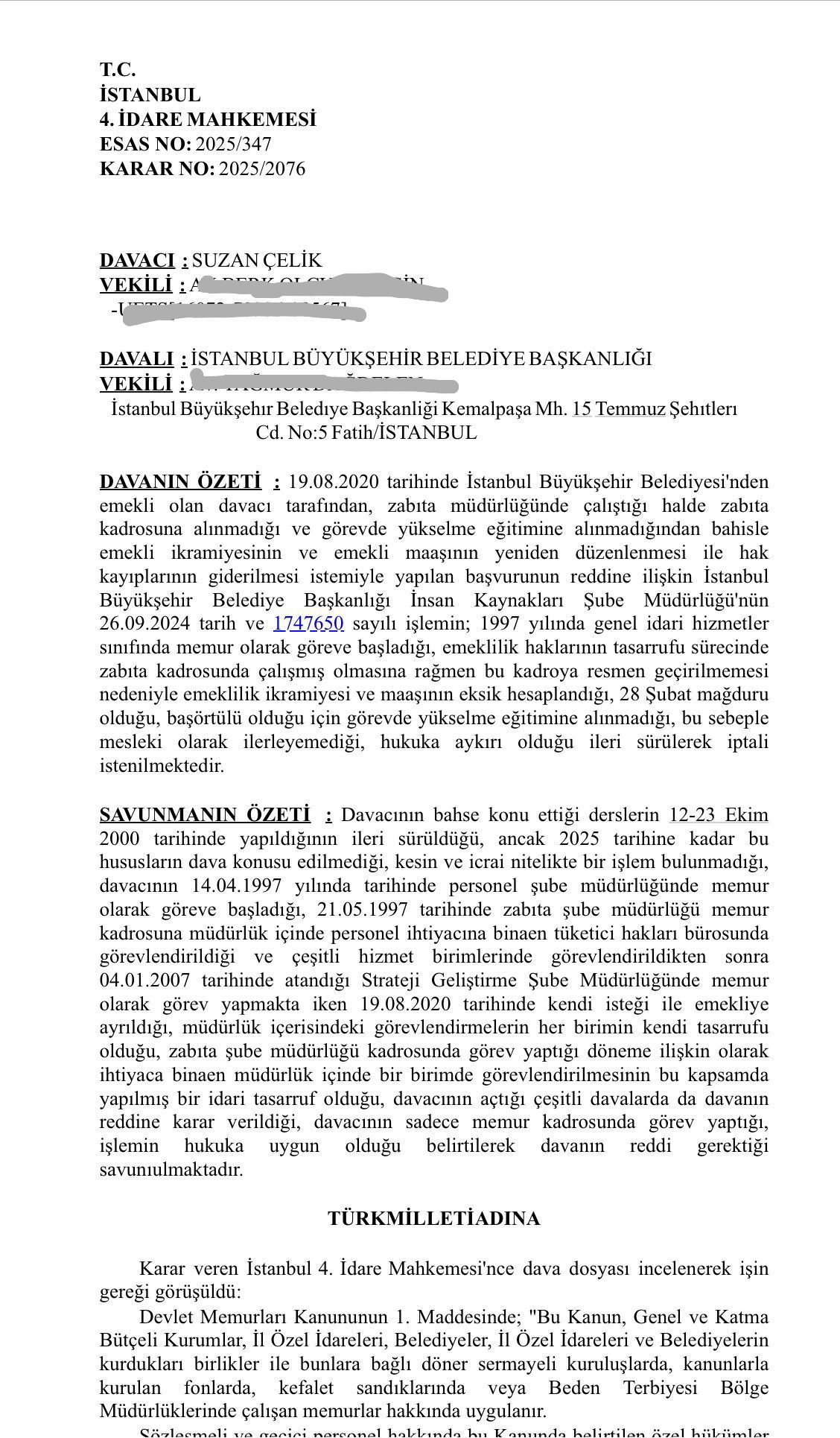 28 Şubat sürecinde başörtüsü konulu mağduriyete dair emekli aylığı ve ikramiyenin düzeltilmesi yolunda açılan dava İstanbul 4. İdare Mahkemesi'nde 2025/347 dosya numarasıyla reddedildi ama Suzan ÇELİK kararın düzeltilmesi için avukatları aracılığıyla istinaf mahkemesine gitti.